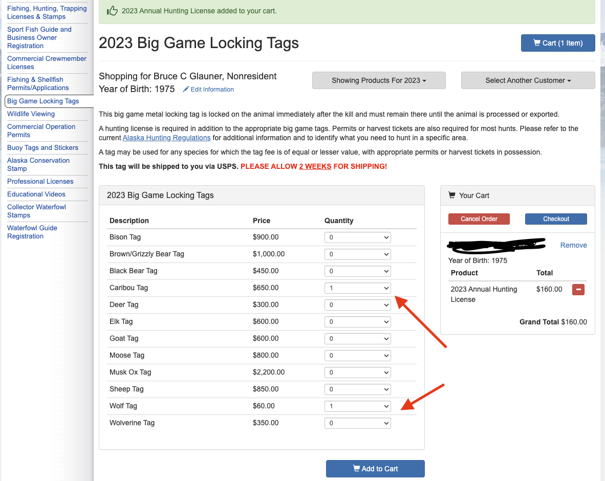 On the next page, add the appropriate tag for what you’ll be hunting. We HIGHLY suggest you always have a wolf tag with you.